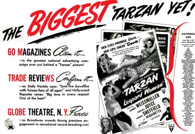 However, the article did not take into consideration the massive publicity campaign with which Lesser had inoculated the film. It was unlike any campaign for a Tarzan film to date. Some sixty magazines sported ads, including Look and Liberty. The success of the campaign may be judged by the attendance at the Globe Theatre in New York, as “Broadway crowds throng premiere engagement in sensational record-breaking run!” Undoubtedly, the change of title and the splashing of seductive photos of Tarzan’s female nemesis had much to do with the results.
